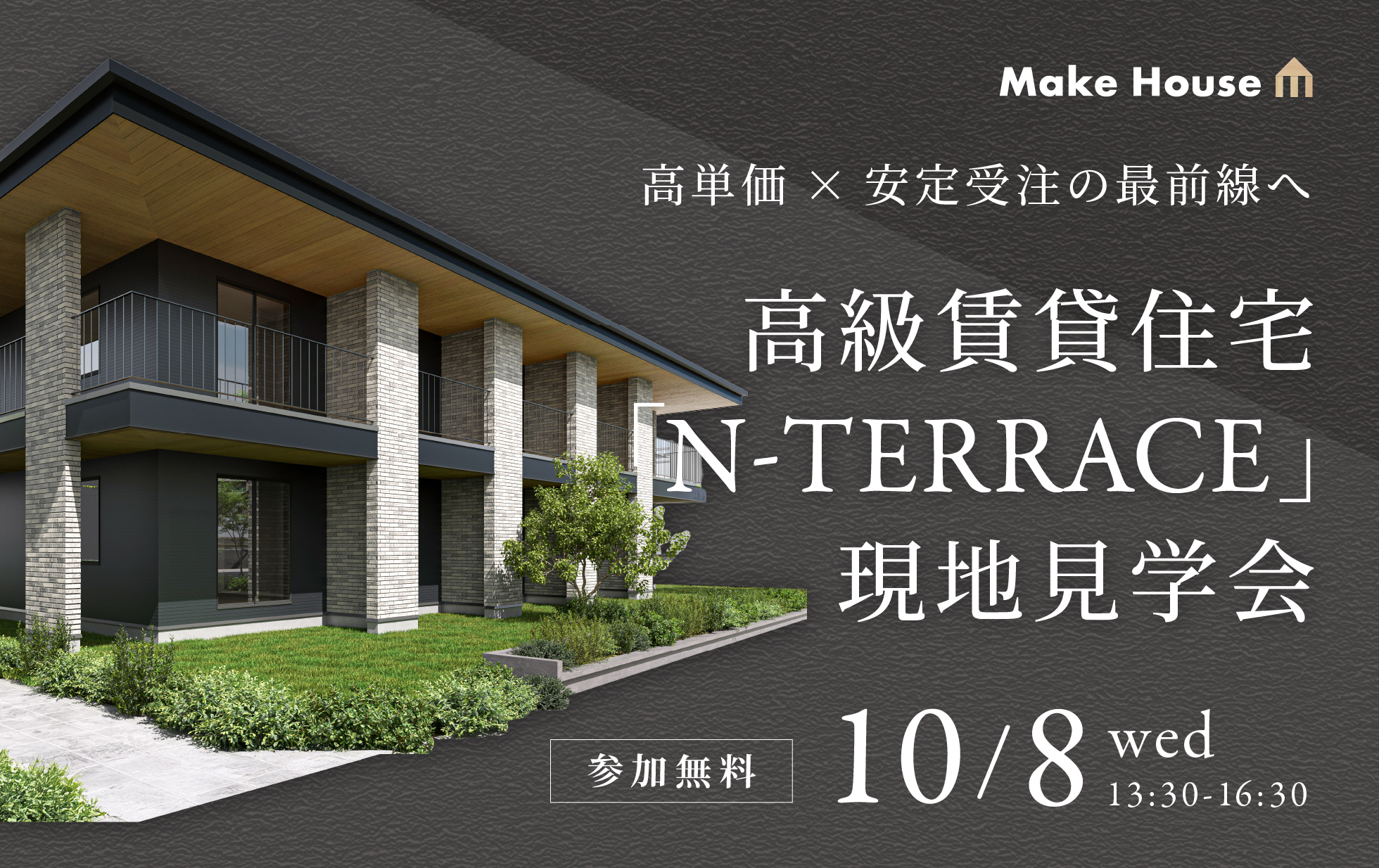 近年、物価高や住宅ローン金利の上昇を背景に、一部では戸建て住宅の購買意欲が減少する傾向が見られます。また、地域によっては住宅着工数の減少が報告される一方で、都市部を中心に賃貸住宅への需要は引き続き堅調です。こうした市場動向を受け、Make Houseでは新たに高性能賃貸住宅商品「N-TERRACE」をリリースいたしました。「N-TERRACE」は、入居者に選ばれる断熱性・耐久性に優れた高品質な賃貸住宅として設計されており、収益性の向上を目指した商品です。本セミナーでは、商品の特長や導入メリット、設計のポイントを詳しくご紹介いたします。市場変化に対応した新たなビジネスチャンスとして、「N-TERRACE」がどのように貢献できるかをお伝えします。住宅需要が厳しい今だからこそ、ぜひご参加ください。