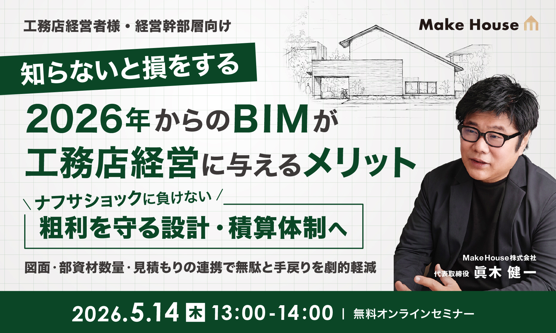 本セミナーでは、専門知識は一切不要です。BIMが工務店経営にどう関係するのかを60分で具体的にお伝えし、コスト構造の改善と営業差別化を同時に実現する考え方を解説します。資材高騰・市場縮小の時代でも利益を確保し、次の一手を打てる経営体制への転換を、ともに考える場としてご活用ください。