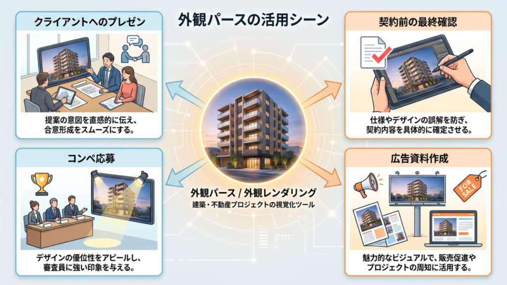 外観パースが使われる主なシーンは、施主へのプレゼン・契約前の最終確認・広告素材制作・コンペの応募など多岐にわたります。