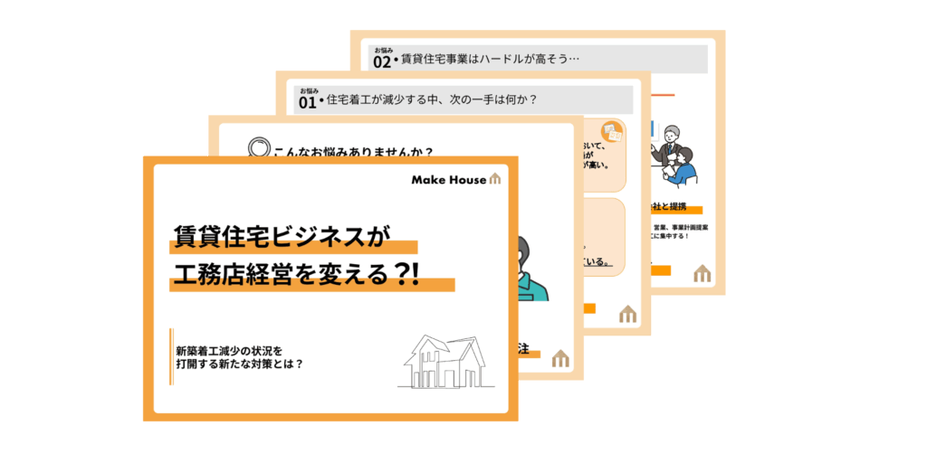 私たちMake Houseは、工務店様に特化したサポートを行っています。賃貸経営から集客までさまざまな相談を受け付けておりますので、いつでもお気軽にお問い合わせください。